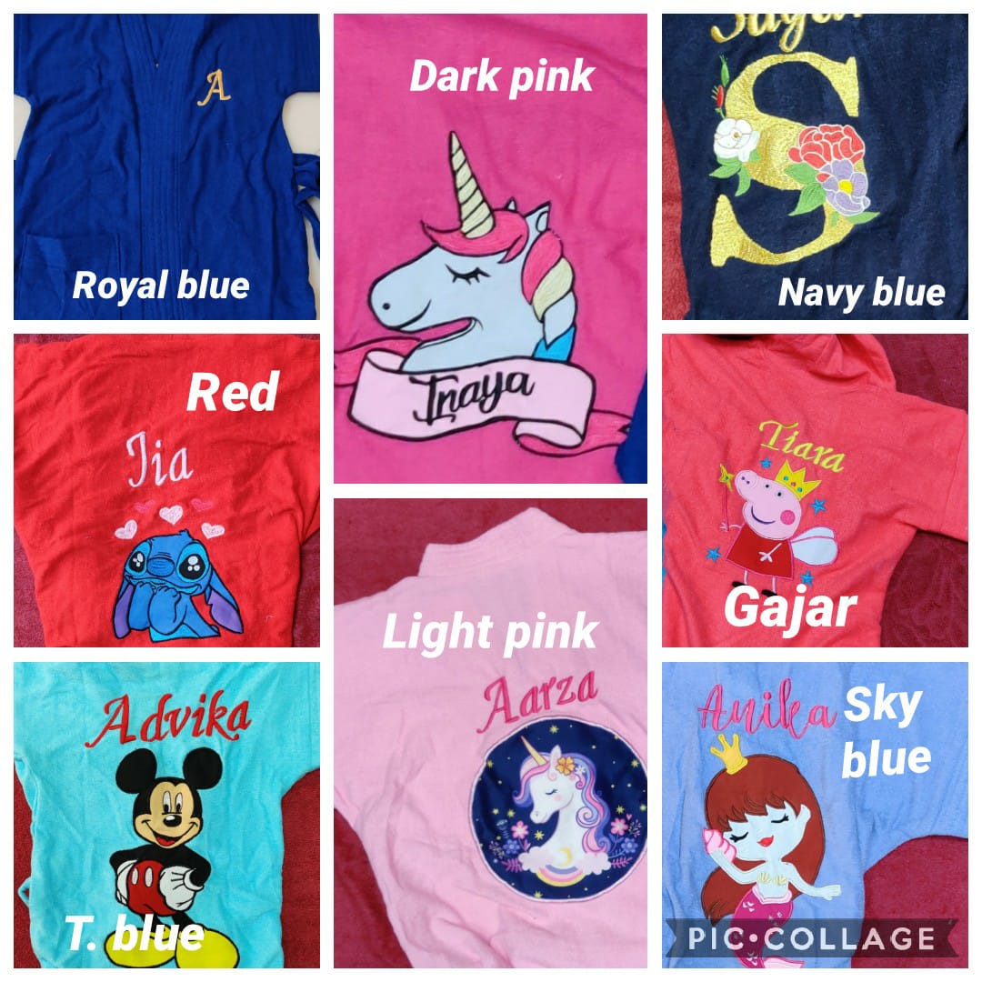 Customized Bathrobes Size | 20" upto 1 year, 25" upto 5 years, 30" upto 8 years, 35" Teens, 40" Adults, 45" XL, 50" XXL |