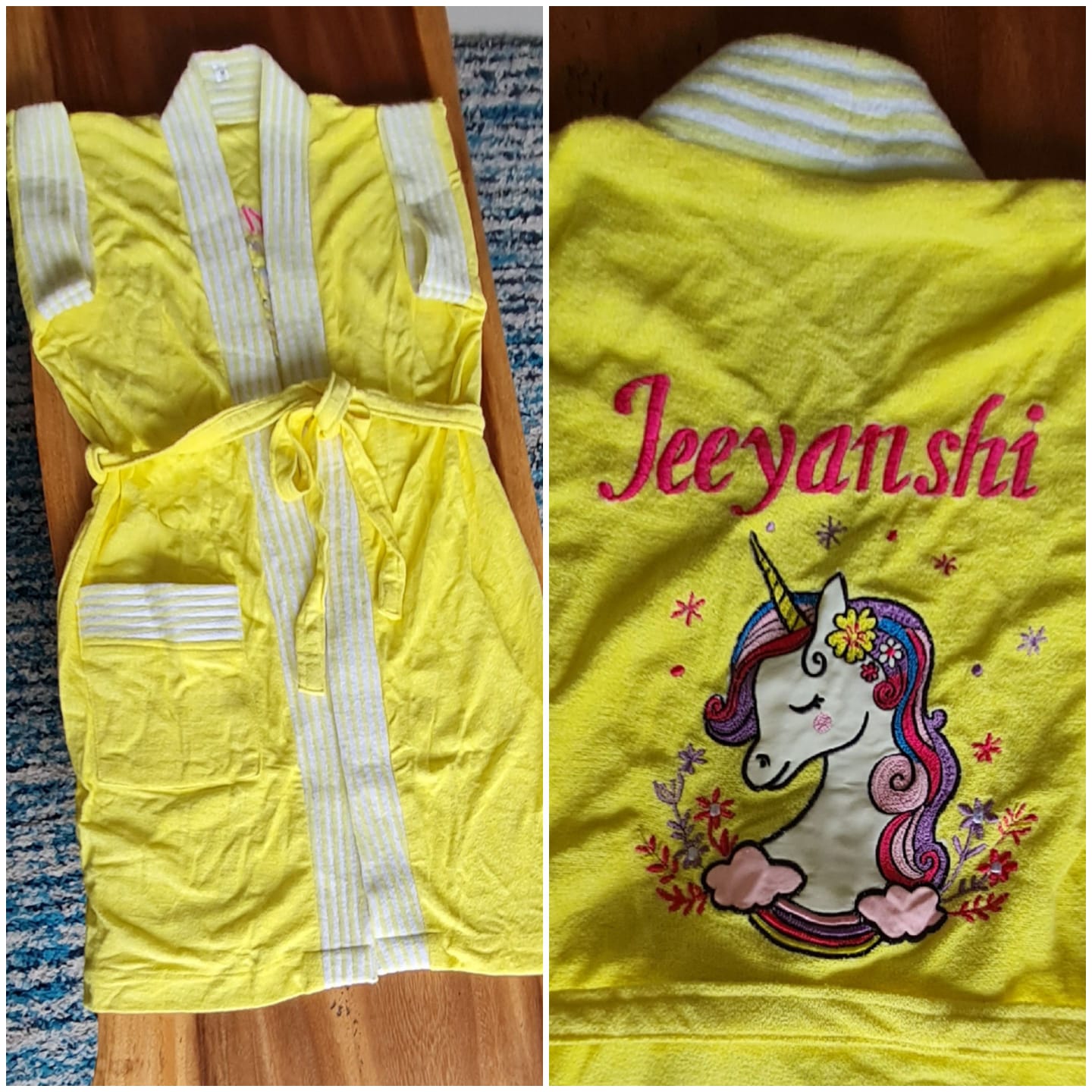 Kuntal, i m glad I chose you for my little ones cute bathrobe. It’s vibrant color… The red car on it and his name on it had my son dancing around all over the house.. the quality i excellent and the packaging itself was so very cute… Love love love your product. Highly recommended…💞💞