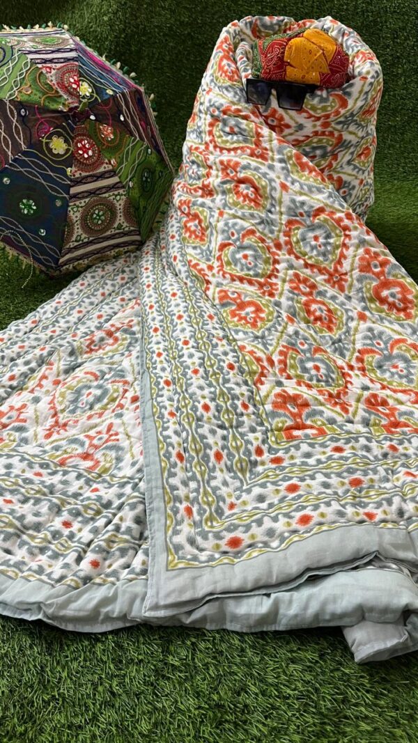 “Snuggle up in comfort with our block printed razai, crafted from ultra-soft pure cotton mulmul and quilted to perfection. Made for cotton lovers, this cozy haven is ideal for cuddling up on chilly nights. The traditional block printing technique adds a touch of rustic charm, while the pure cotton fabric ensures breathability and softness against your skin. Wrap yourself in this quilted razai and indulge in a peaceful slumber.”